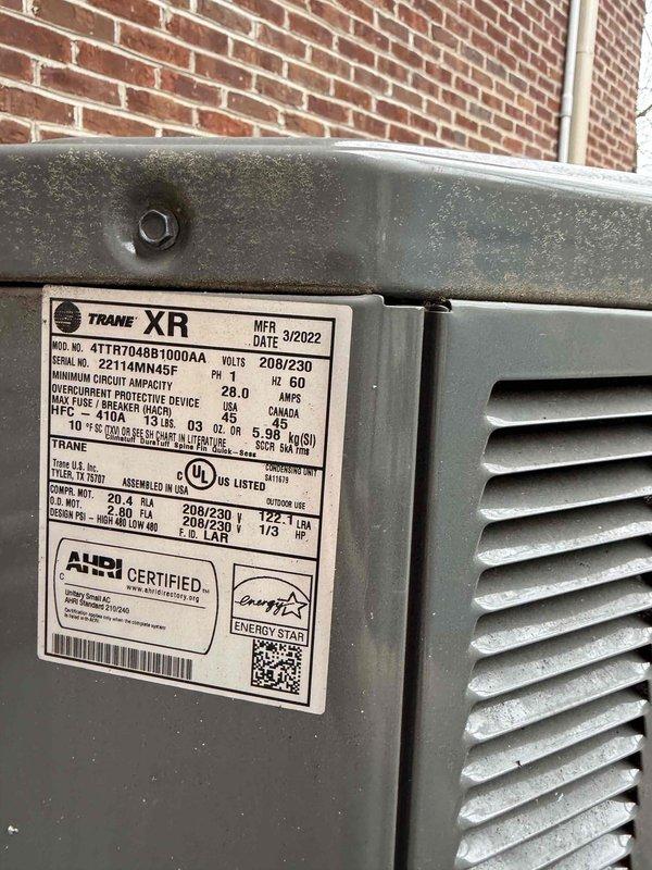 Responded to thermostat issue reported by homeowner. Upon arrival, verified system operation and confirmed both heating and cooling functions working properly. Documented equipment information for Trane XR heat pump unit (Model: 4TTR7048B1000AA, Serial: Z114MN45F, manufactured March 2022) and assessed thermostat functionality, noting age of thermostat unknown but system responding to temperature calls correctly.